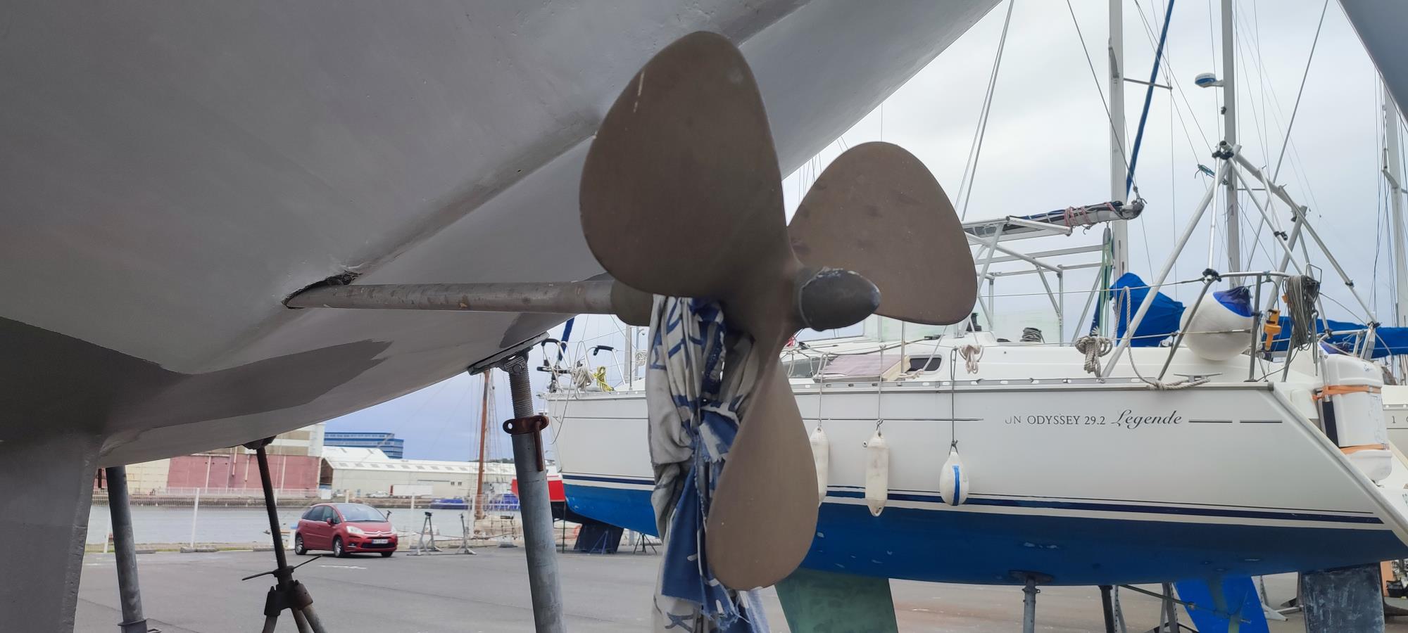 Le modèle proposé est une seconde main, entretenu sérieusement pour pouvoir naviguer loin (moteur récent, travaux sur dérive et coque, dormant de 2018 …). Il dispose d’une jupe et d’un portique supportant une éolienne et trois panneaux solaires. L’autonomie n’est pas oubliée avec 180 L de GO et 360L d’eau.