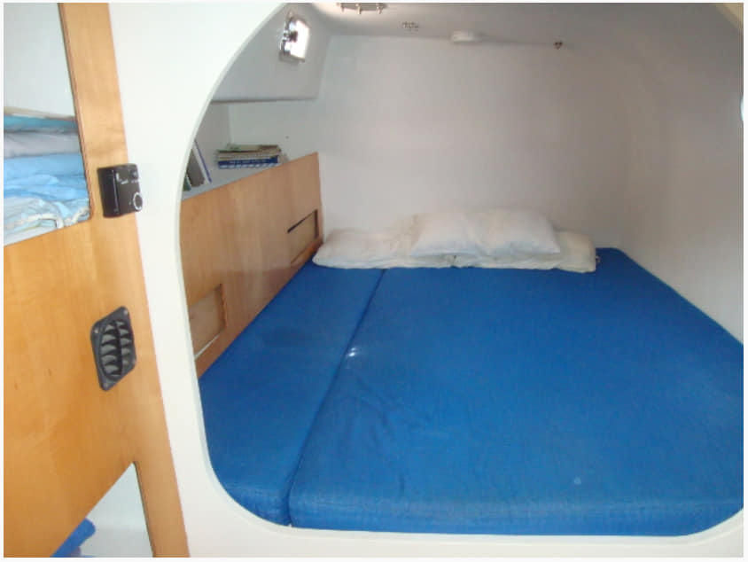 Deux belles cabines arrière et une cabine avant accueillent l´équipage. Un salle d´eau dans chaque coque complète le confort du bord.