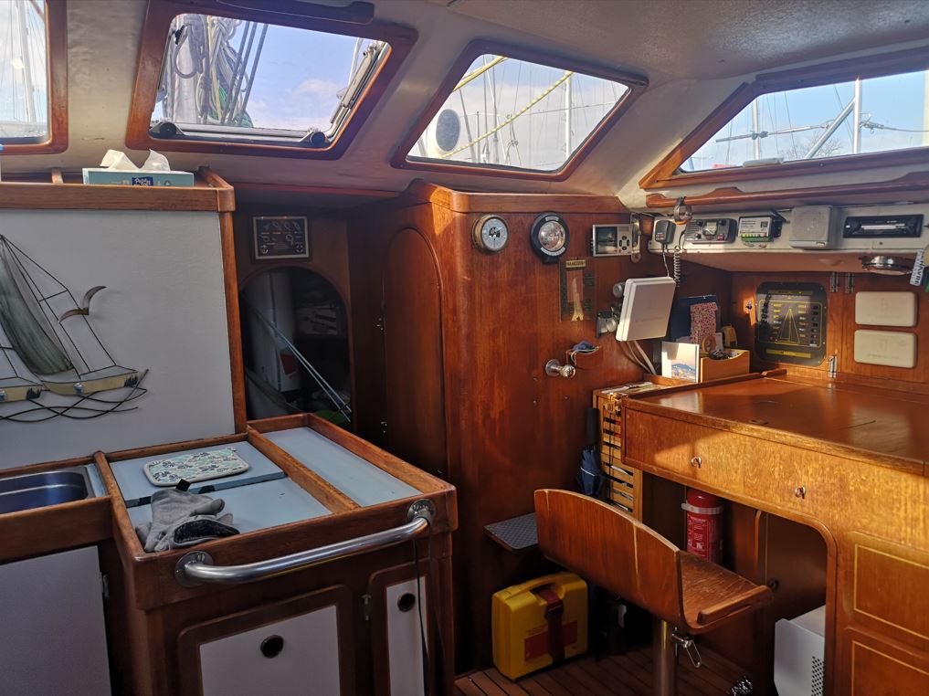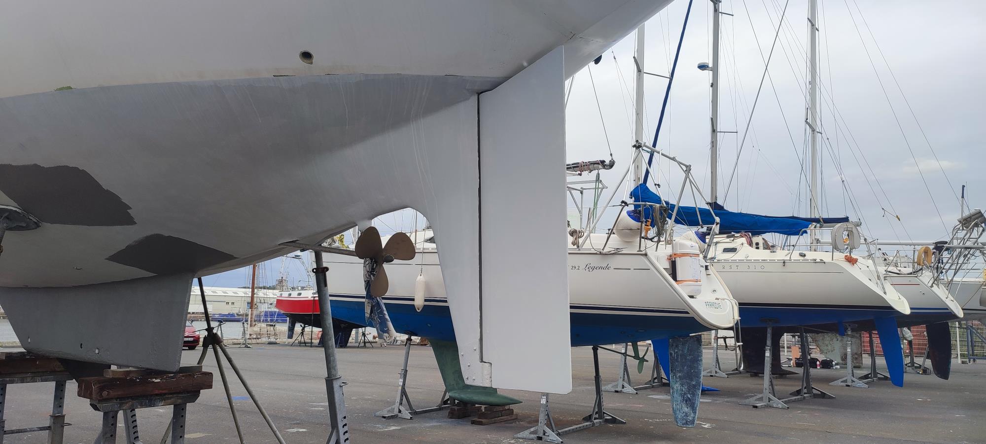 Le modèle proposé est une seconde main, entretenu sérieusement pour pouvoir naviguer loin (moteur récent, travaux sur dérive et coque, dormant de 2018 …). Il dispose d’une jupe et d’un portique supportant une éolienne et trois panneaux solaires. L’autonomie n’est pas oubliée avec 180 L de GO et 360L d’eau.